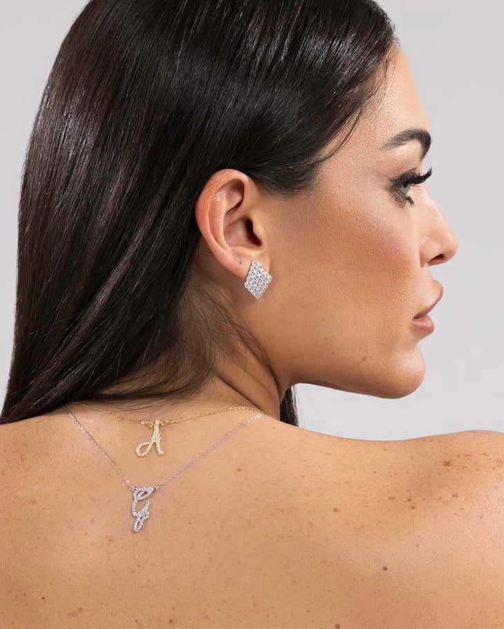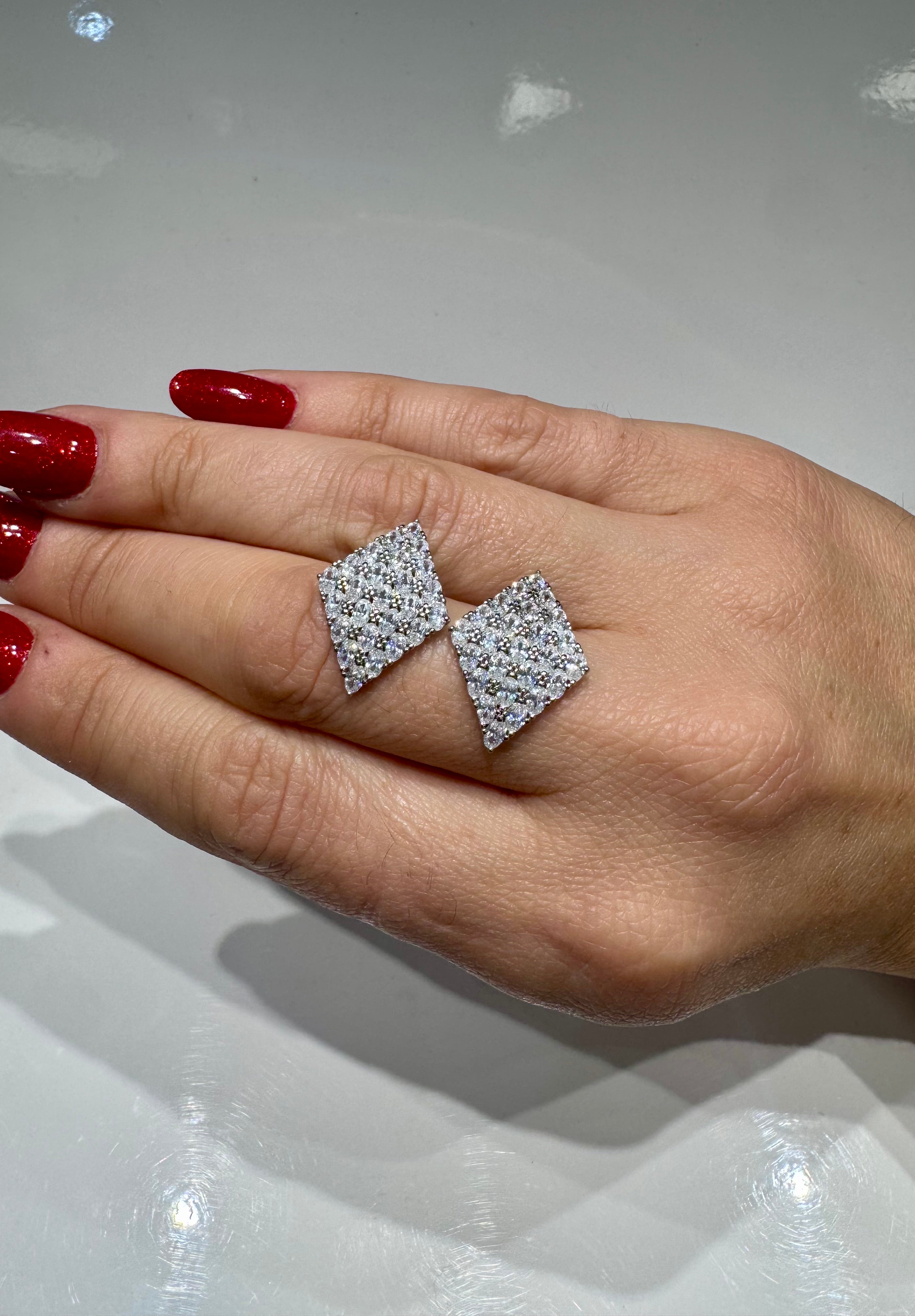 Raffinati orecchini a lobo dalla moderna forma a rombo, realizzati in argento 925. La superficie è interamente impreziosita da una pavé di pietre luminose che dona brillantezza e un effetto scintillante ad ogni movimento.
