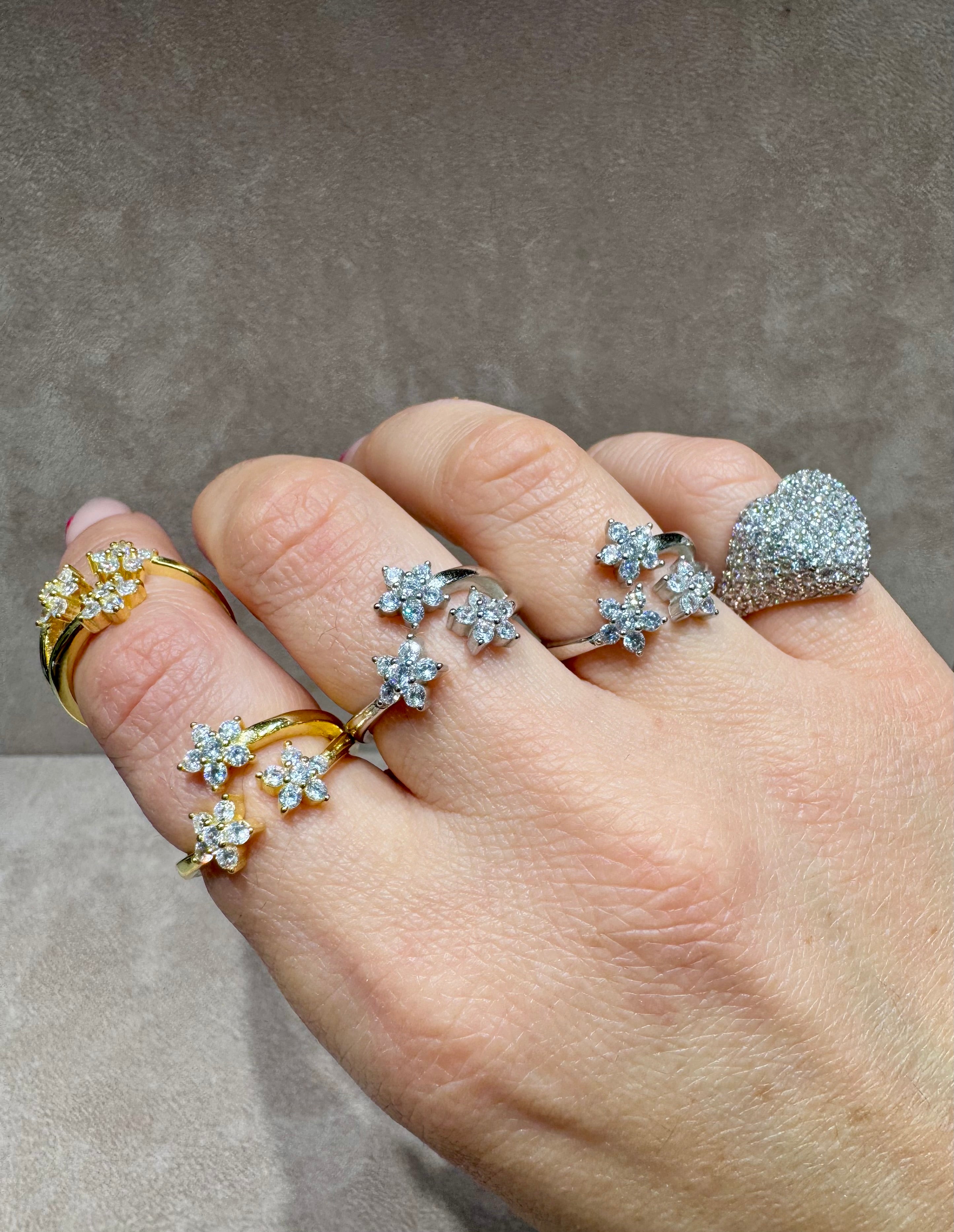 L’Anello Re Iris è un gioiello raffinato e luminoso, realizzato in argento 925 ed e impreziosito da delicati elementi a forma di fiore con pietre brillanti che catturano la luce con discrezione, creando un effetto sofisticato ma leggero, perfetto per chi ama i dettagli ricercati.
