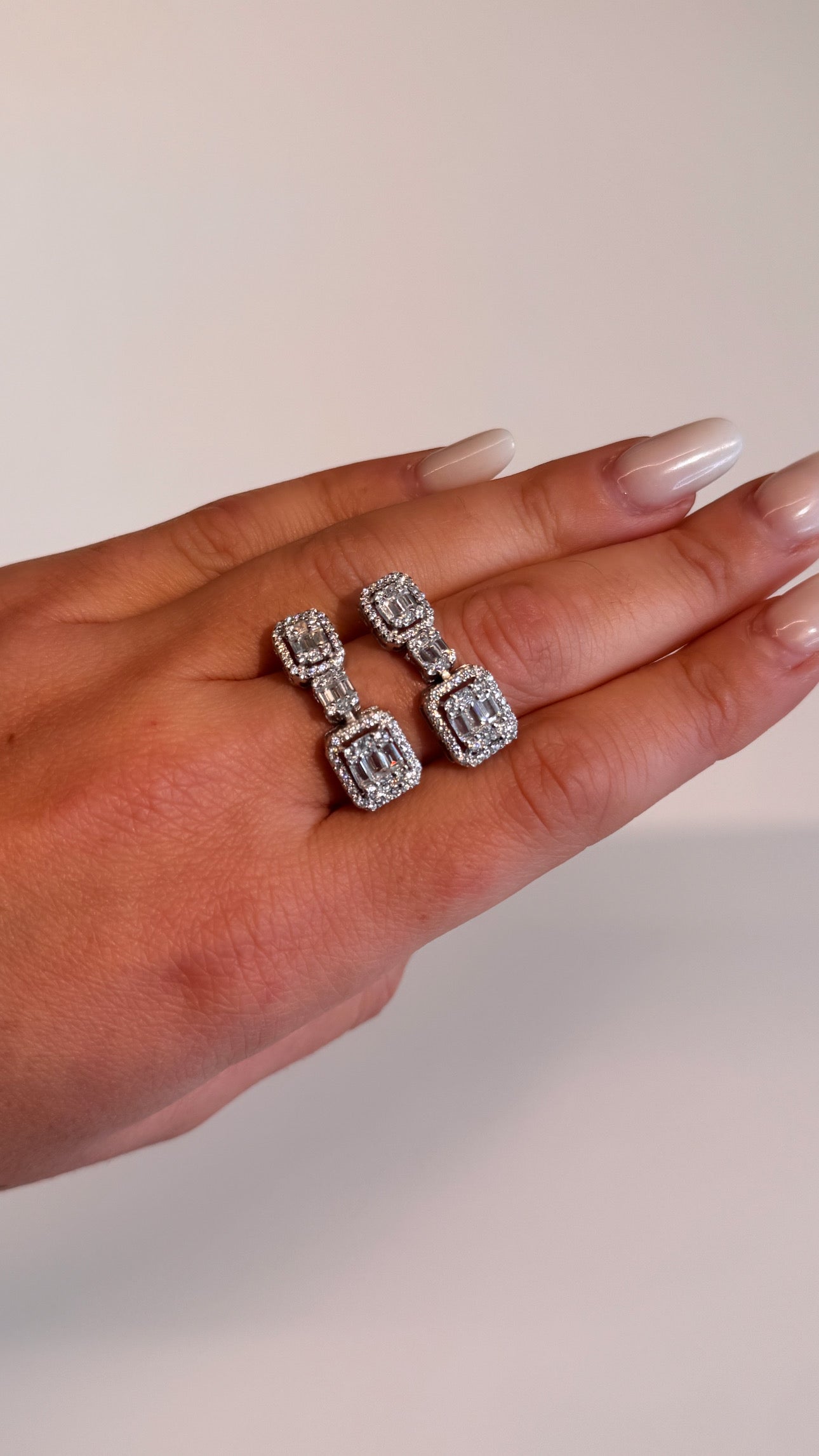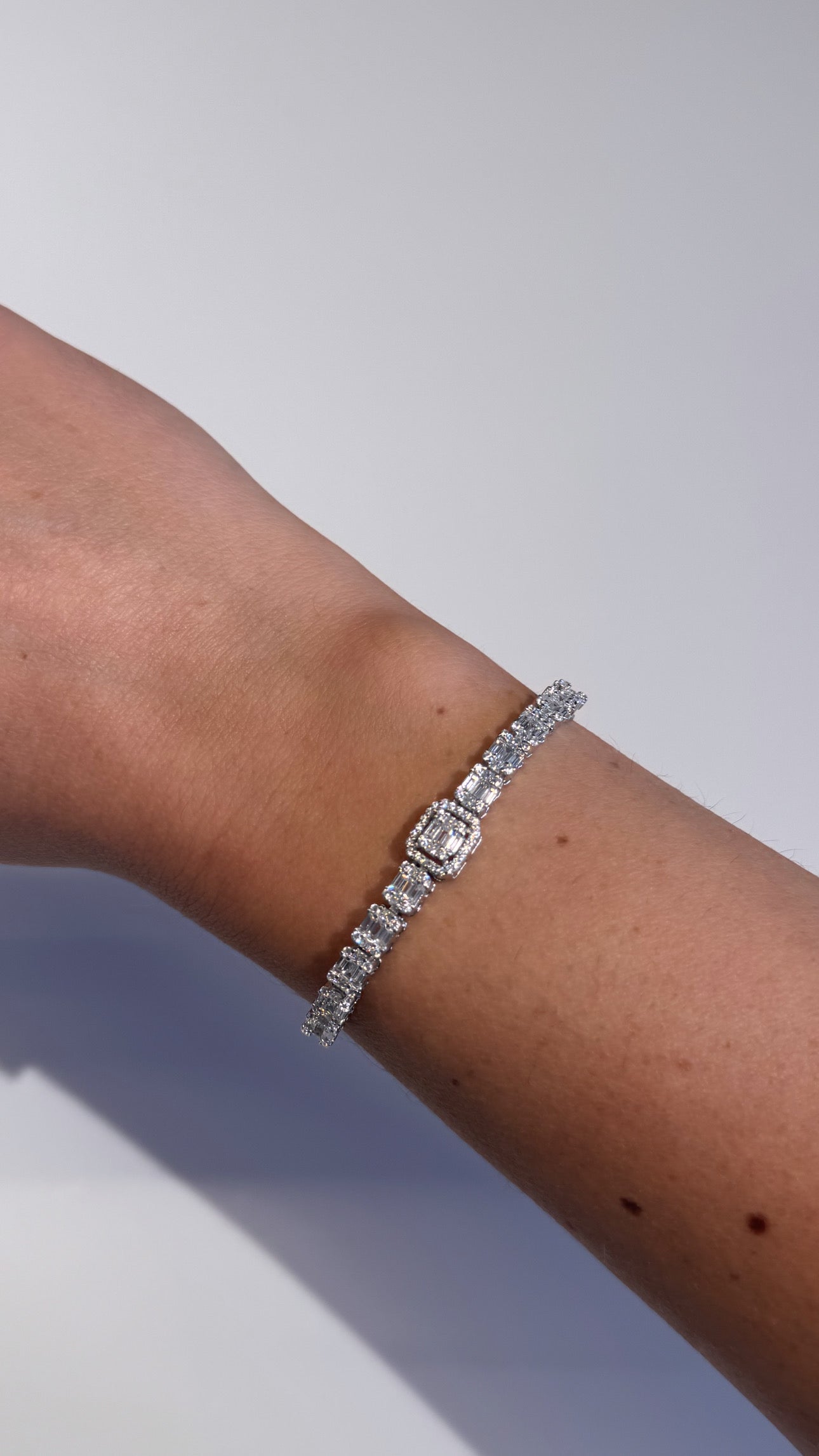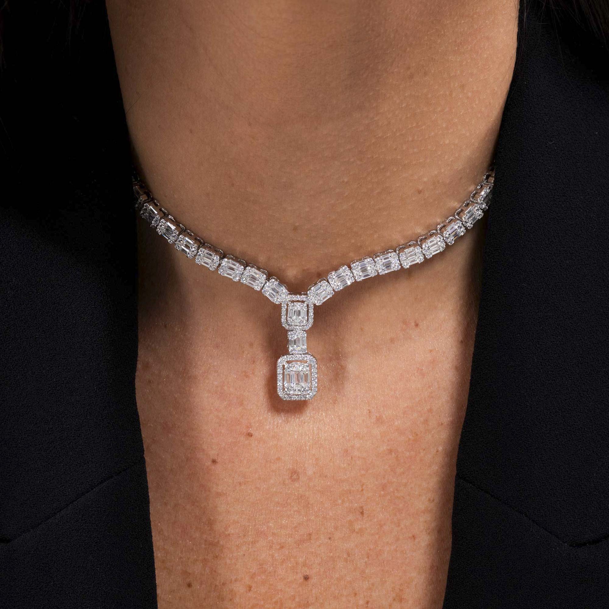 Il collier Regina di Luce in argento 925 è un gioiello dal fascino iconico e sofisticato. La linea si compone di una sequenza di gemme rettangolari incastonate con precisione, che creano una luminosità uniforme e avvolgente.